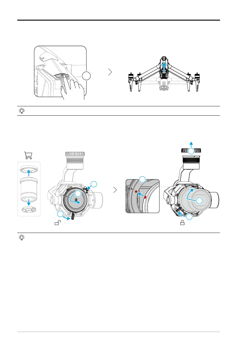 3. Remove the protective covers of the lens and gimbal camera lens mount. Install the lens (sold