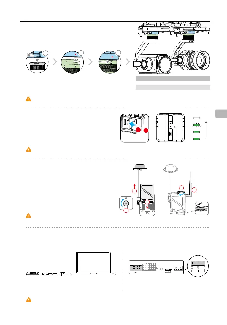 • Zorg dat het D-RTK-grondsysteem eerst wordt ingeschakeld. Zet het luchtsysteem NIET aan voordat de bedrijfsstatus-LED van het D-RTK-grondsysteem continu