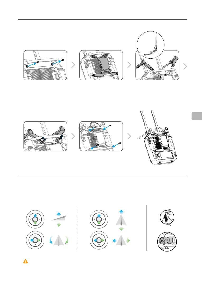 поворотом дрона, правый — для управления движением вперед, назад, влево и вправо. Для регулировки курсовой камеры нажмите и