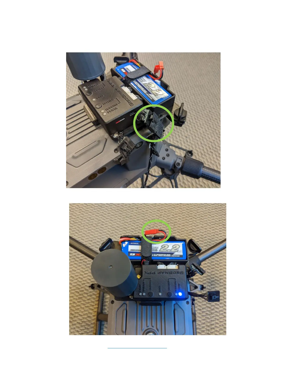 5. When you’re ready to fly, plug in the red battery power connector on the GeoSnap PPK.