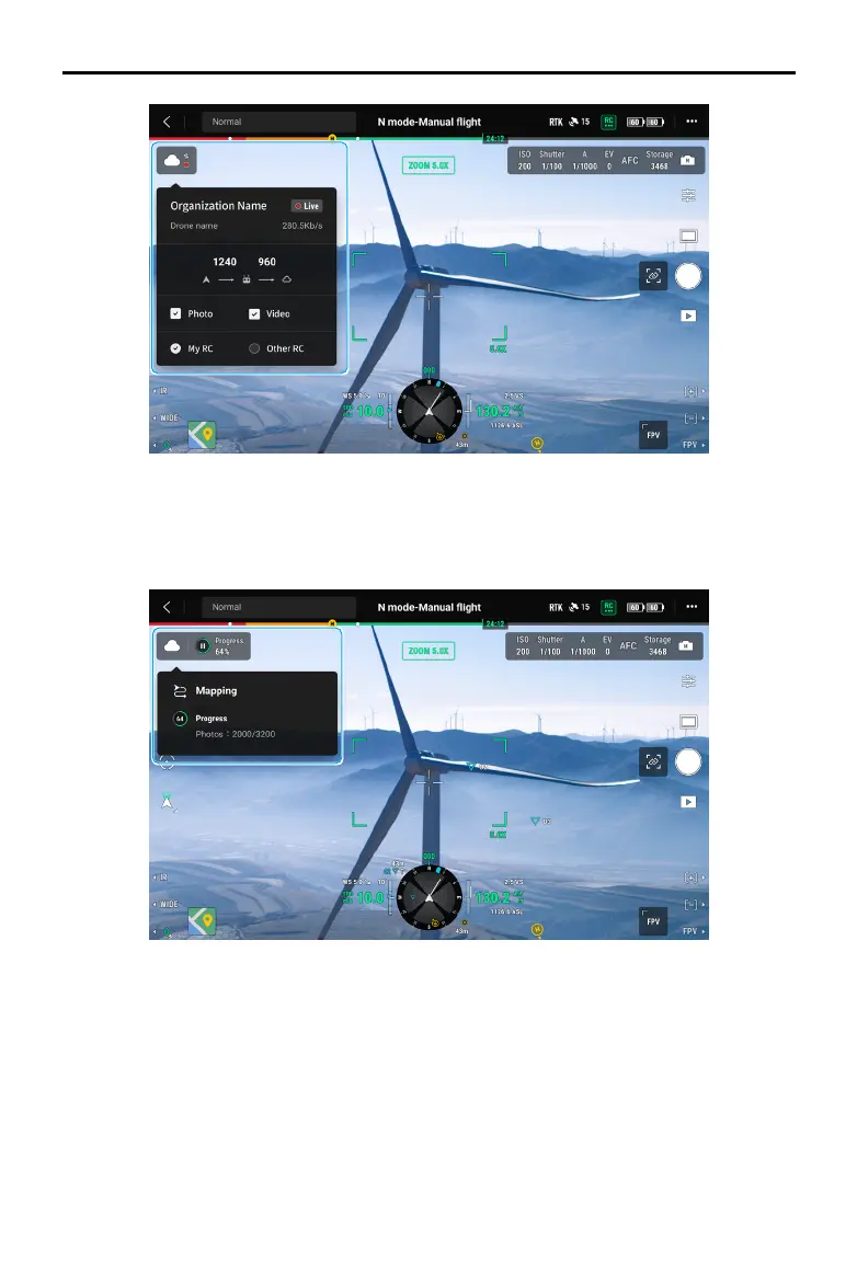 26. Mission Flight Control/Status: displays the progress of a mission ight in gimbal camera view. Tap