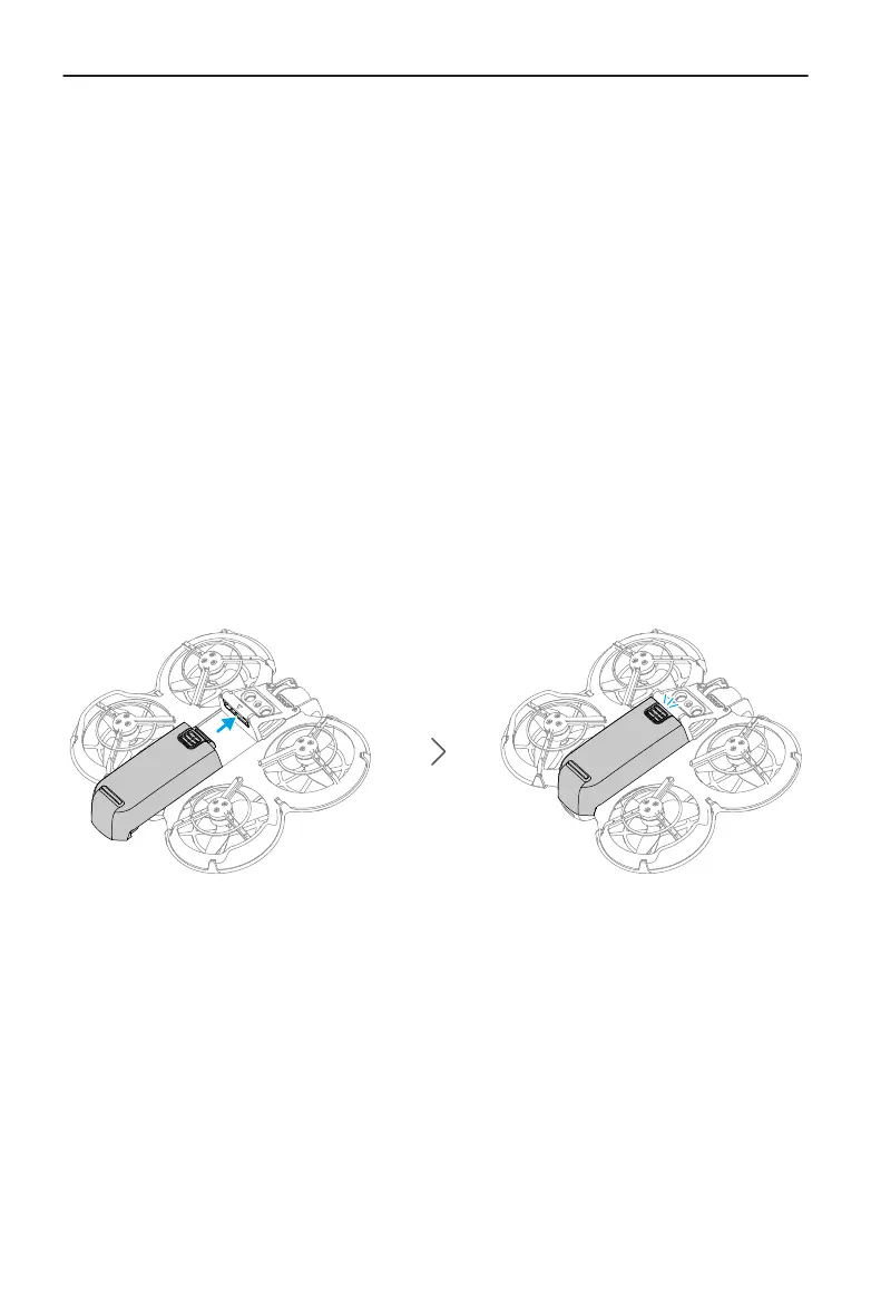 Press the textured part of the battery latch and push the battery to the rear of DJI Neo to