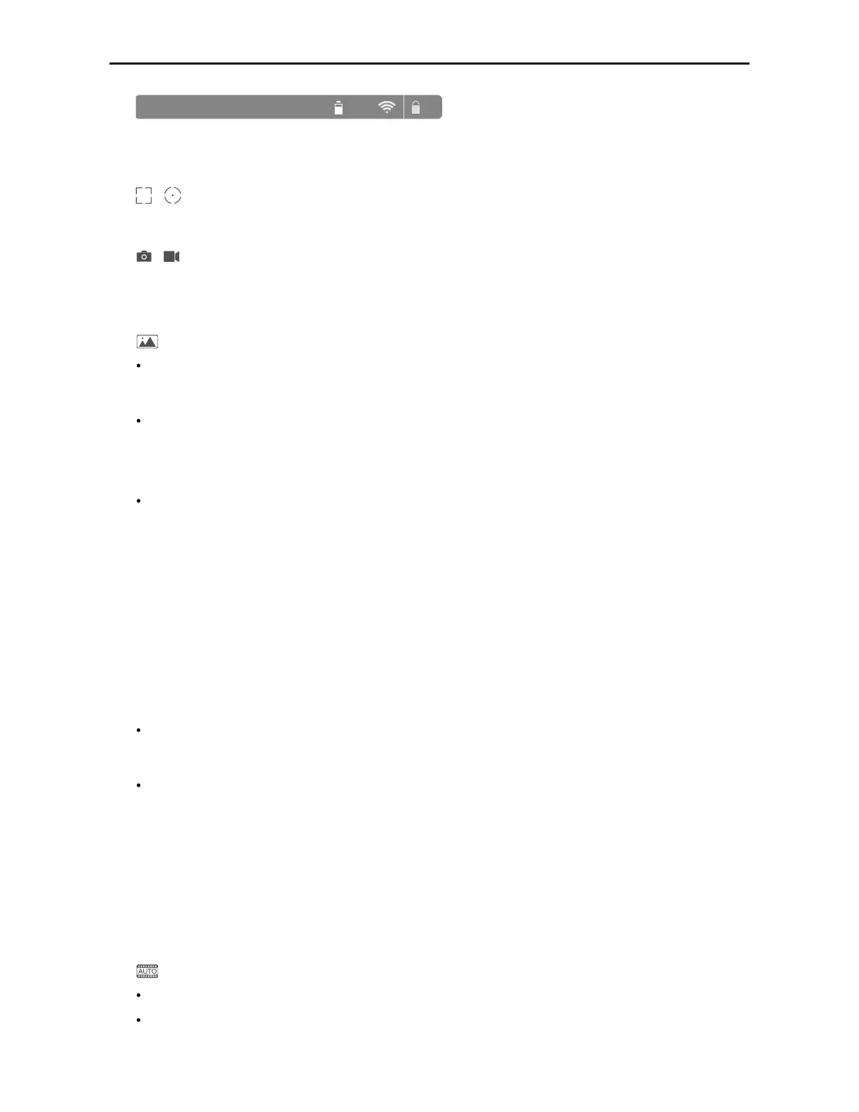 Displays the camera parameters, current battery level, and Wi-Fi signal strength.
