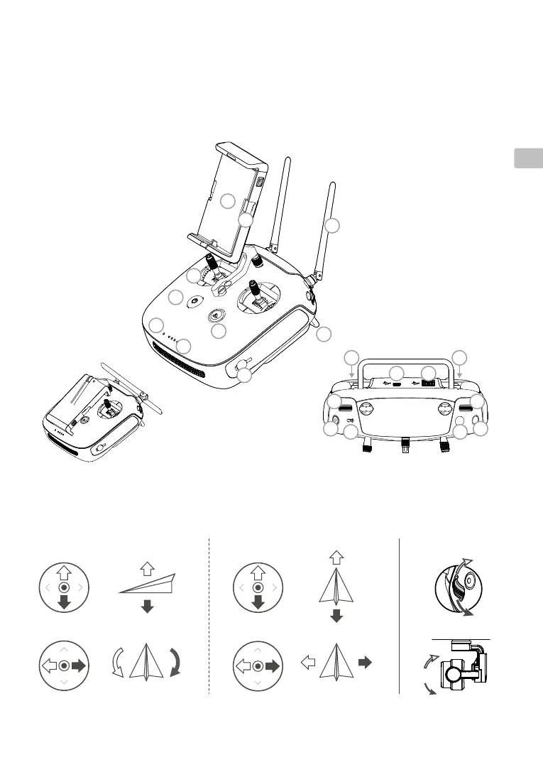右飛行。雲台俯仰控制轉盤可控制相機的俯仰拍攝角度。