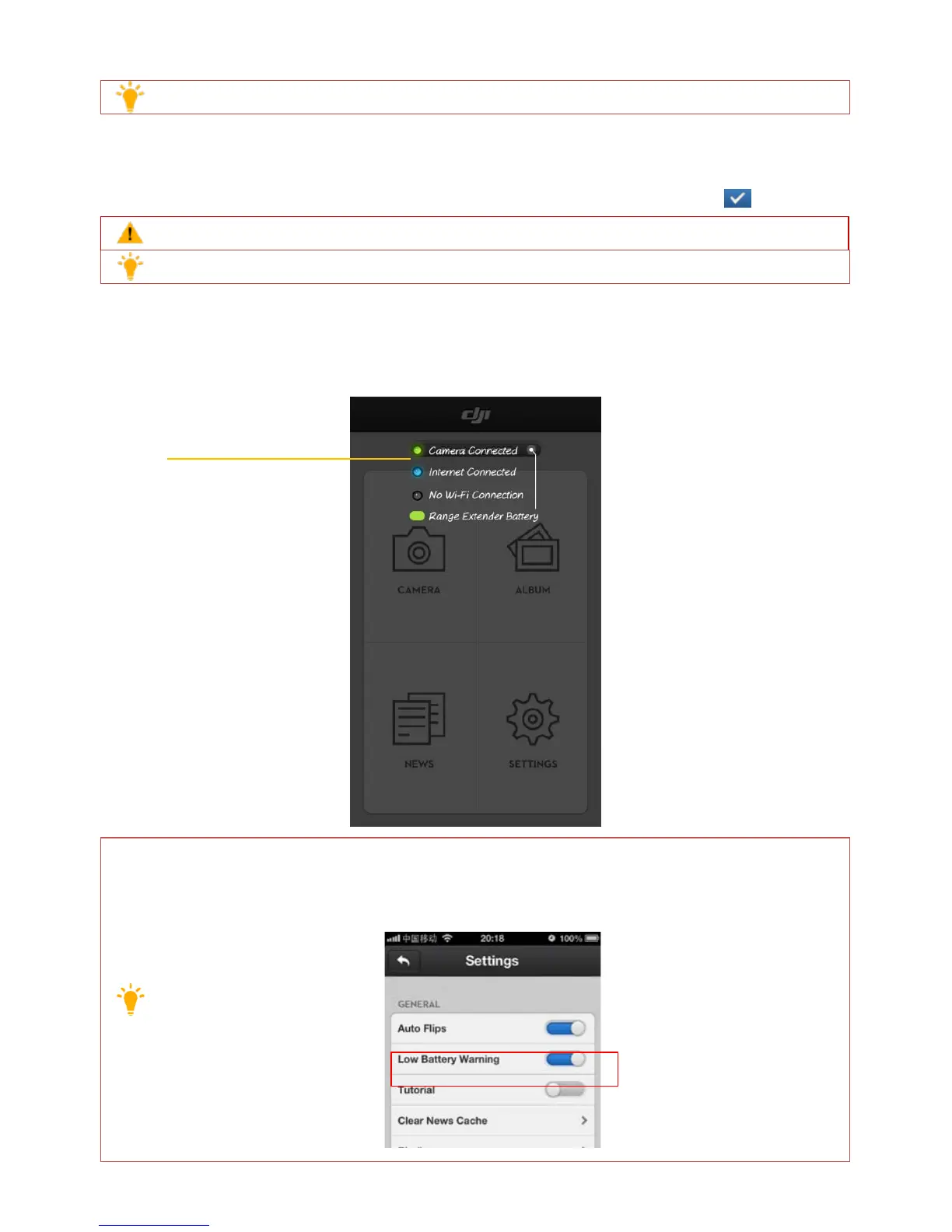 Enable “Tutorial” switch in Settings page, the usage tips will display as the first time you login the App,