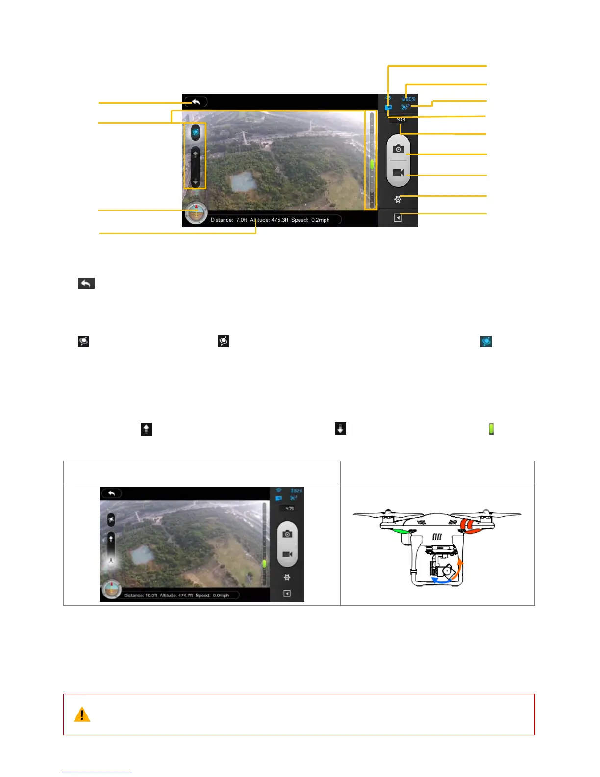 Tap up arrow to pitch camera u pwards and down arrow to pitch downwards. Green slider indicates