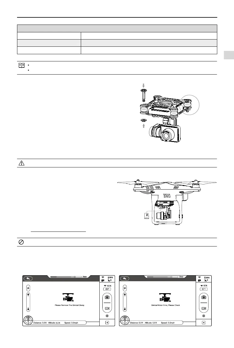 Before the aircraft takes off, if a gimbal motor error is detected or the gimbal clamp is not removed, there will be a