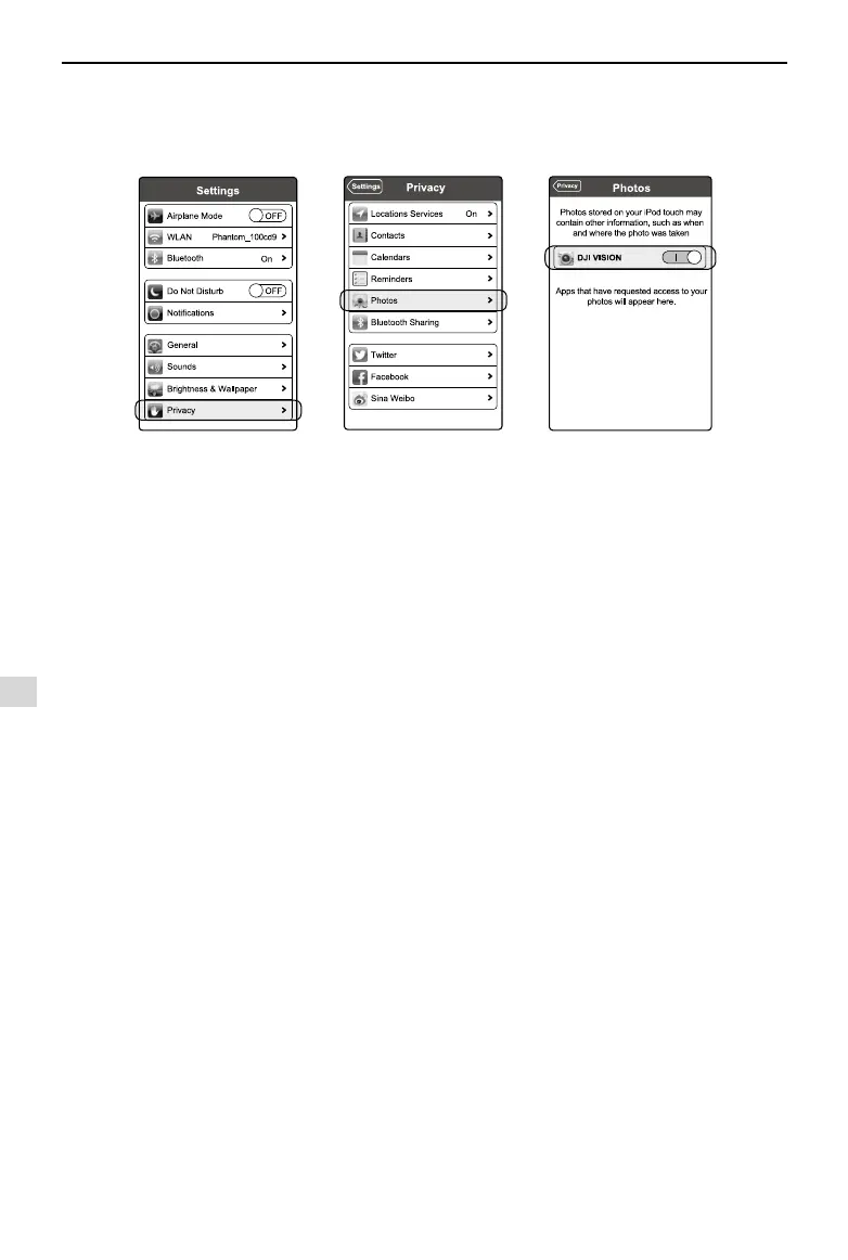 Solution: Reset the settings of your mobile device as illustrated below. Enable the Settings -> Private -> Photos -> DJI