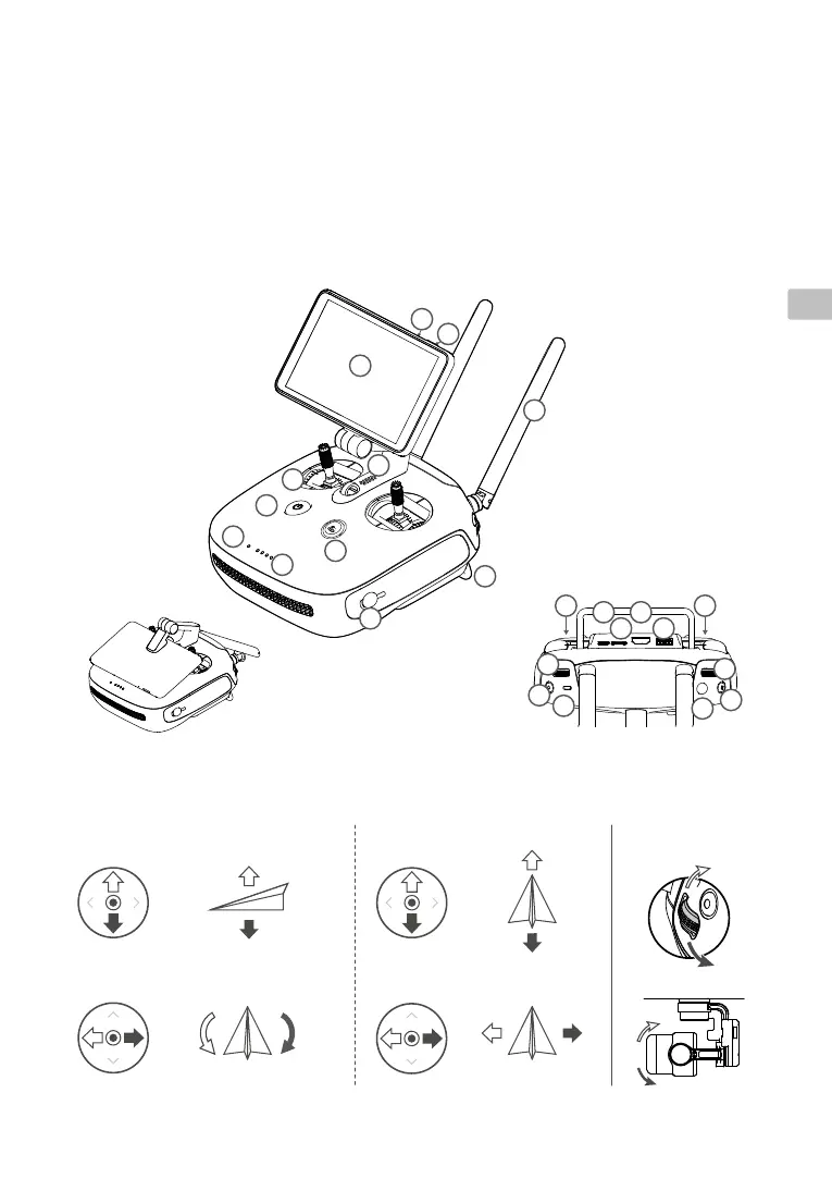 velivolo, mentre la levetta destra controlla i movimenti in avanti, all'indietro, a sinistra e a destra dello stesso. Il
