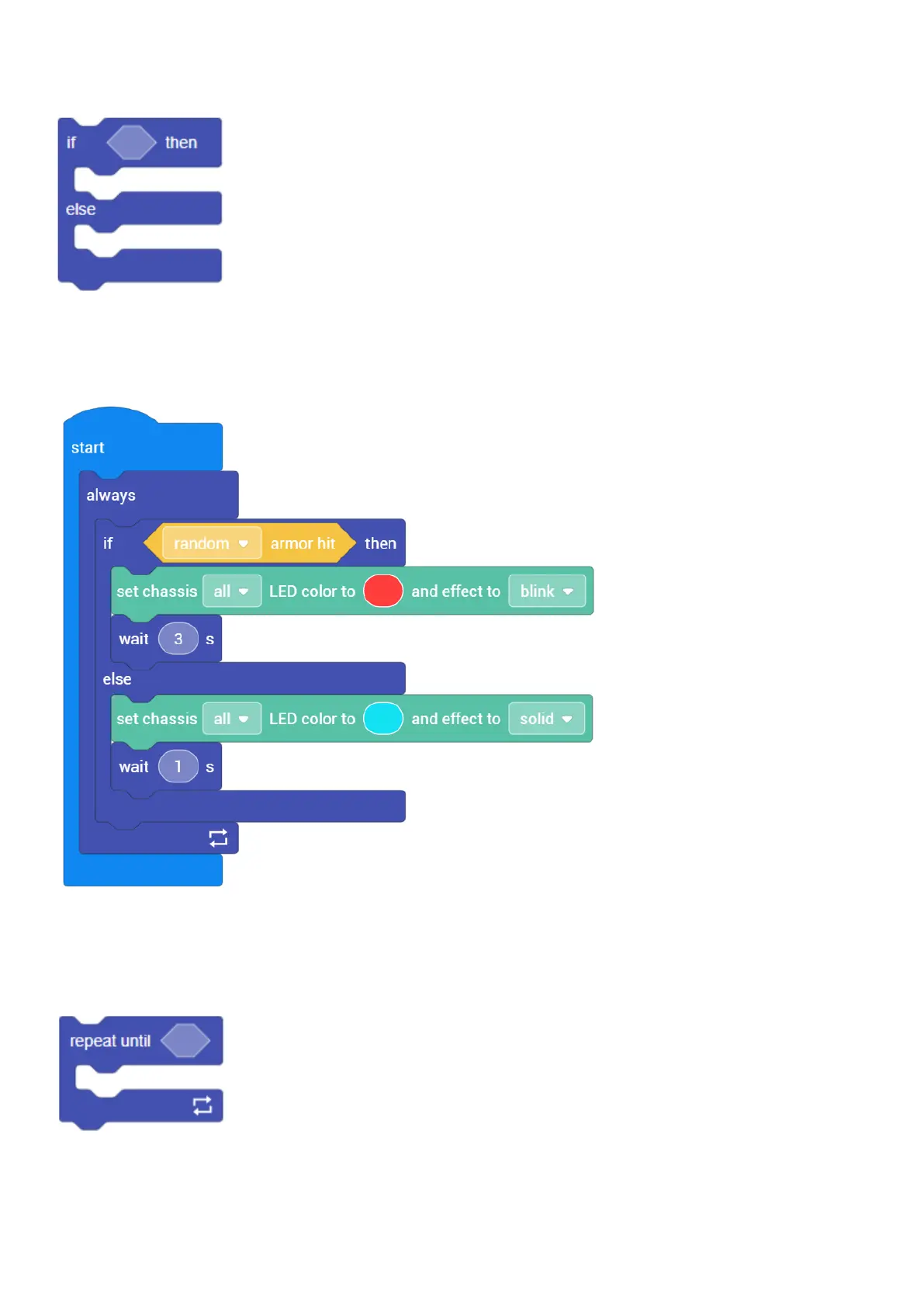If any armor of the robot is attacked, all the chassis LEDs will blink red; otherwise, the default LED effect is solid on.