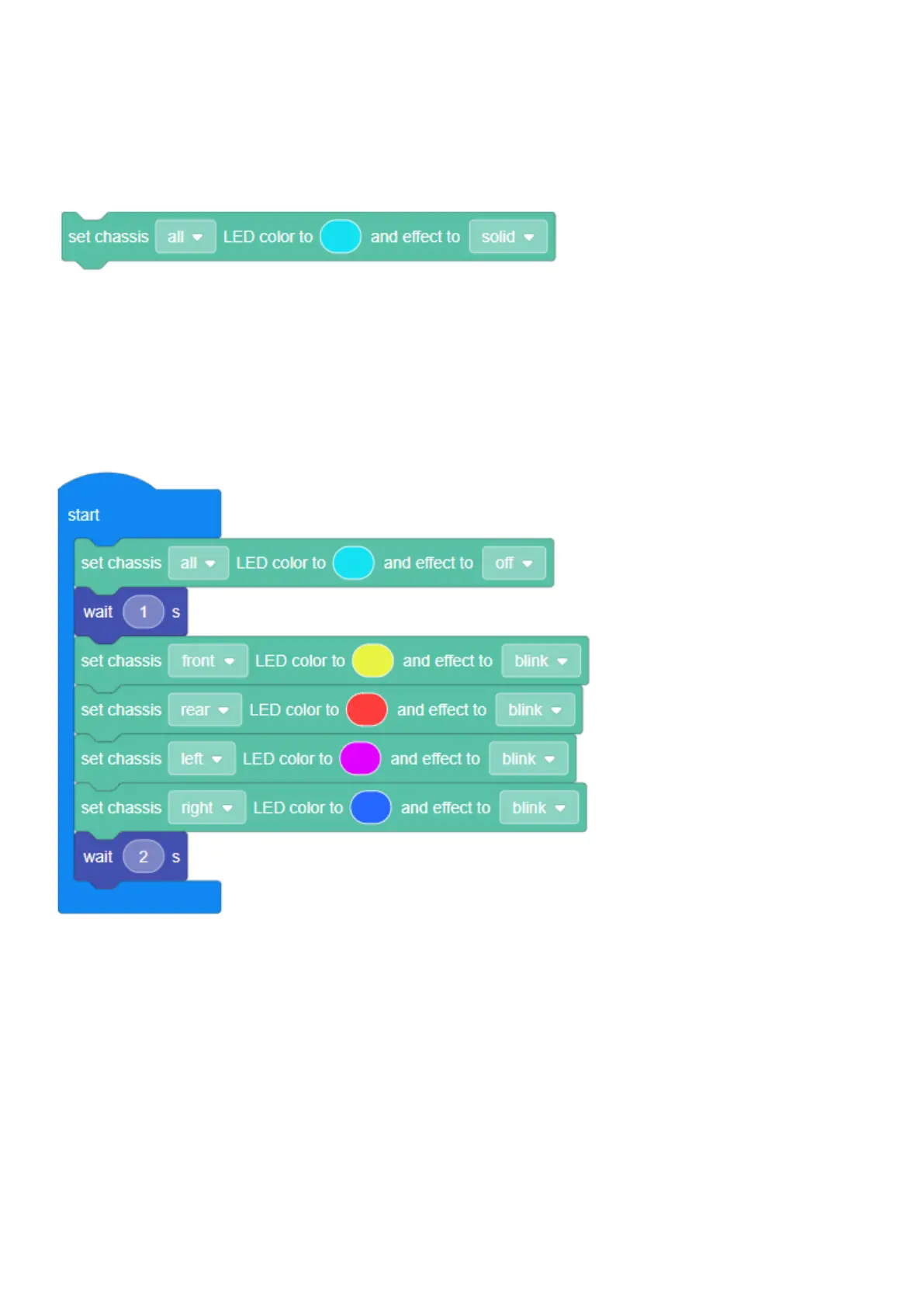 This will set the robot to switch off all LEDs on the chassis for one second, and then flash all LED colors in sequence.