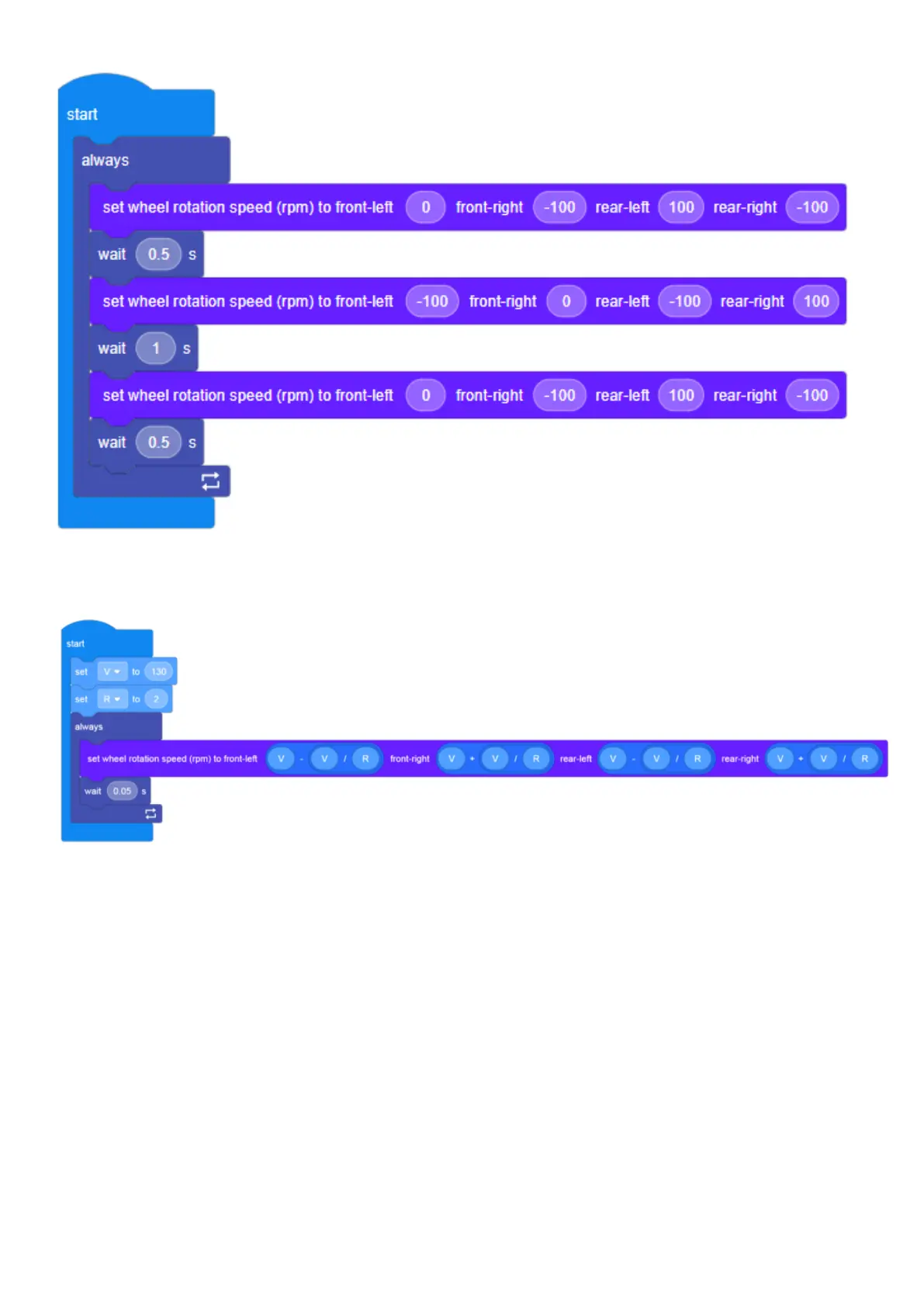 front-right wheel, 100 rpm for the rear-left wheel, and 100 rpm for the rear-right wheel.
