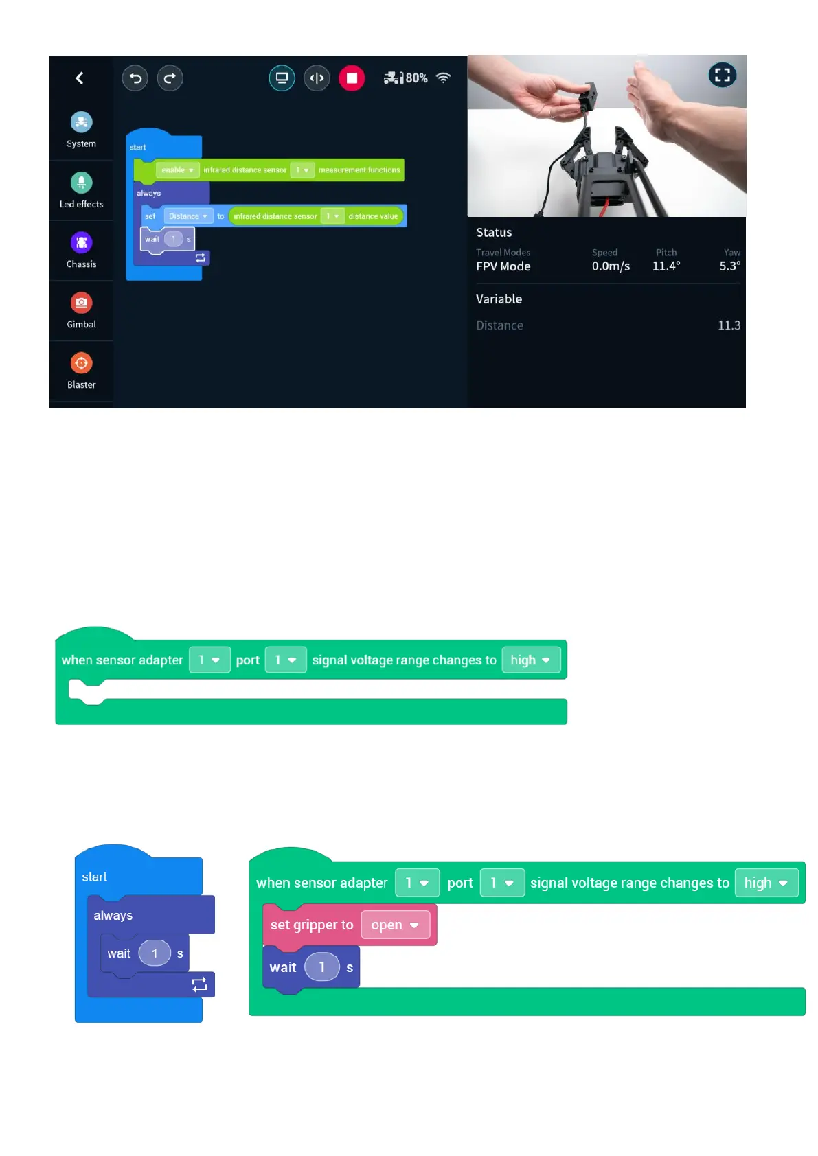 Connect a button to sensor adaptor No. (1). When the button is pressed, the robot gripper opens. When the button is released, the
