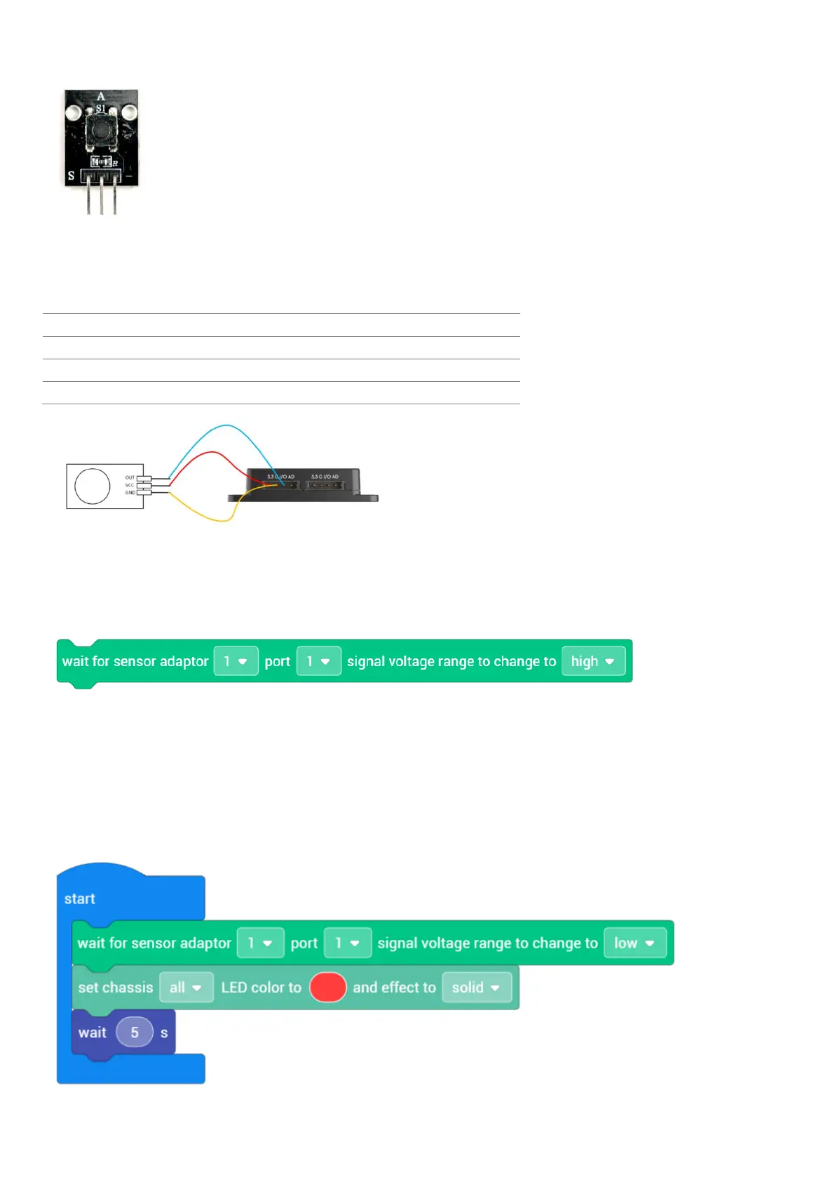 2) The three pins on the button need to be connected to the designated spots of the sensor adaptor through DuPont wires:
