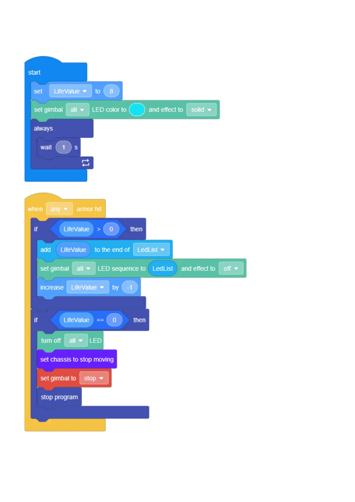 When any point on the armor is hit, the robot’s HP reduces by 1; when the HP level drops to 0, all LEDs will