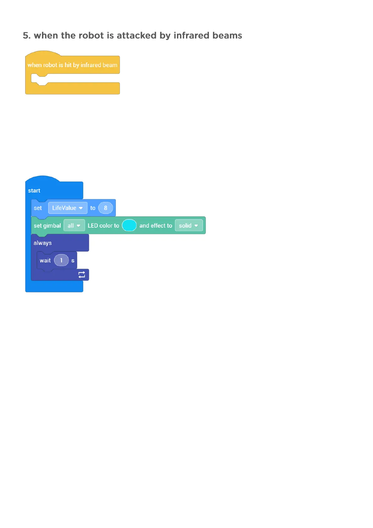 When the robot is attacked by infrared beams, the robot loses 1 hit point; when the hit point is 0, the LED