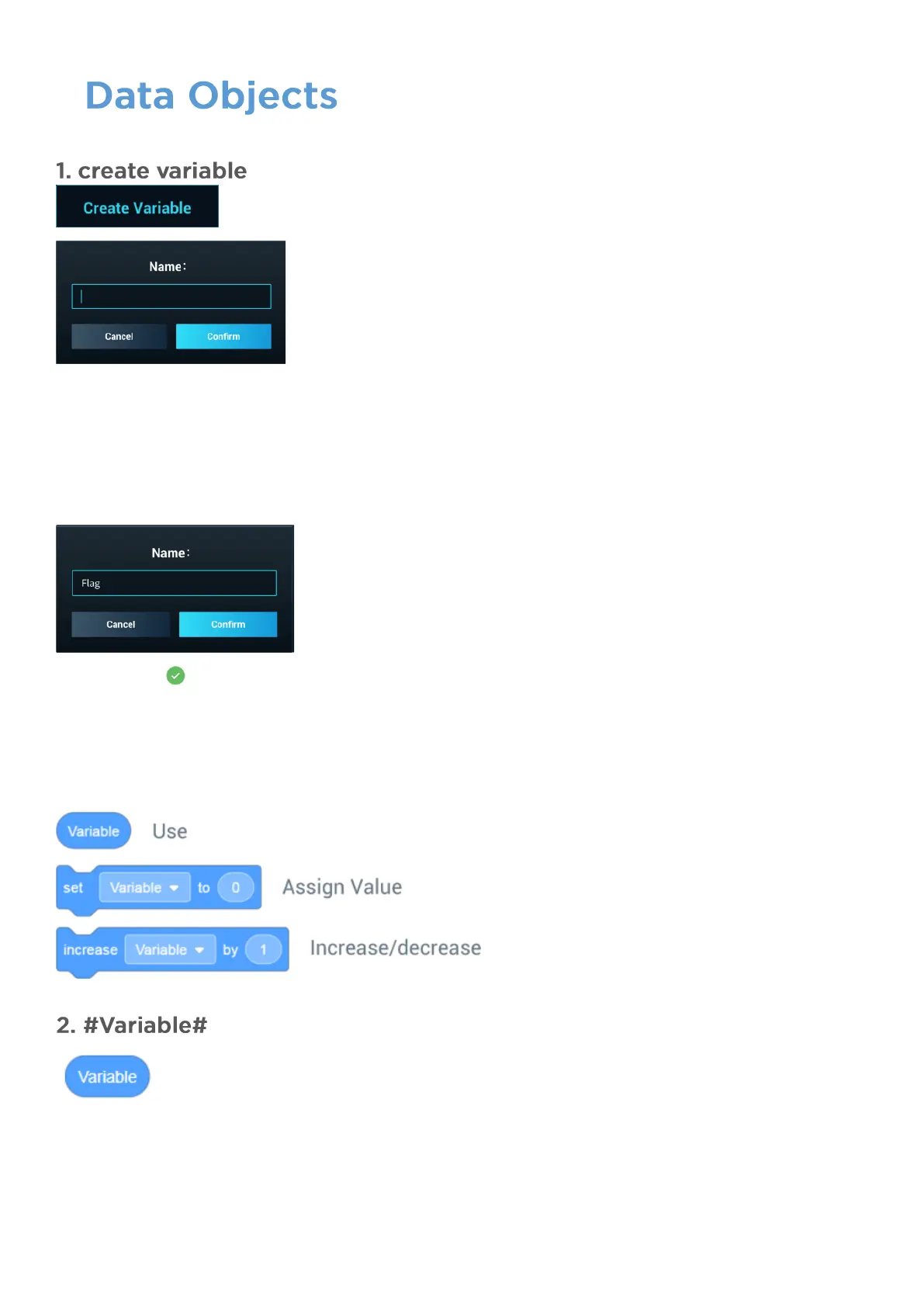 After a variable name is created, you can assign and adjust the value using the three blocks available.