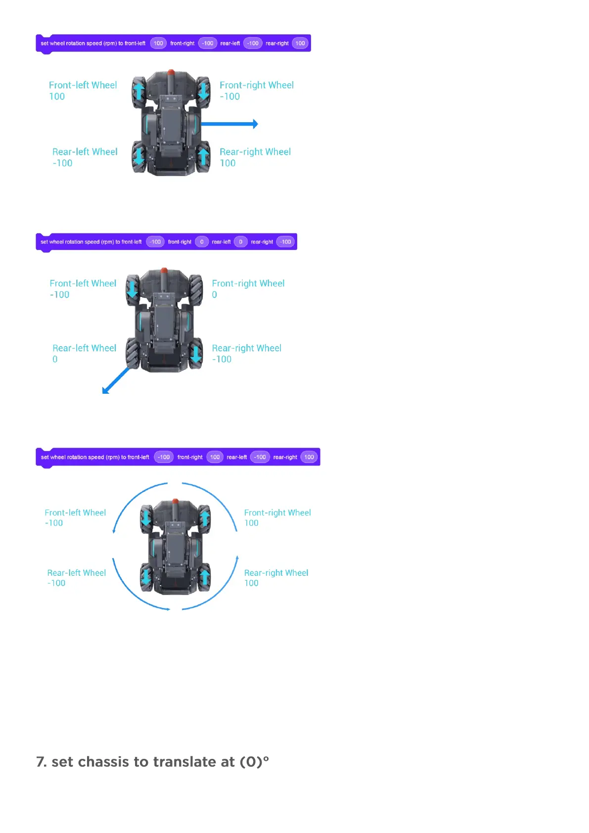 backward, so their rotation speed values should be negative, while the front-right wheel and the rear-left