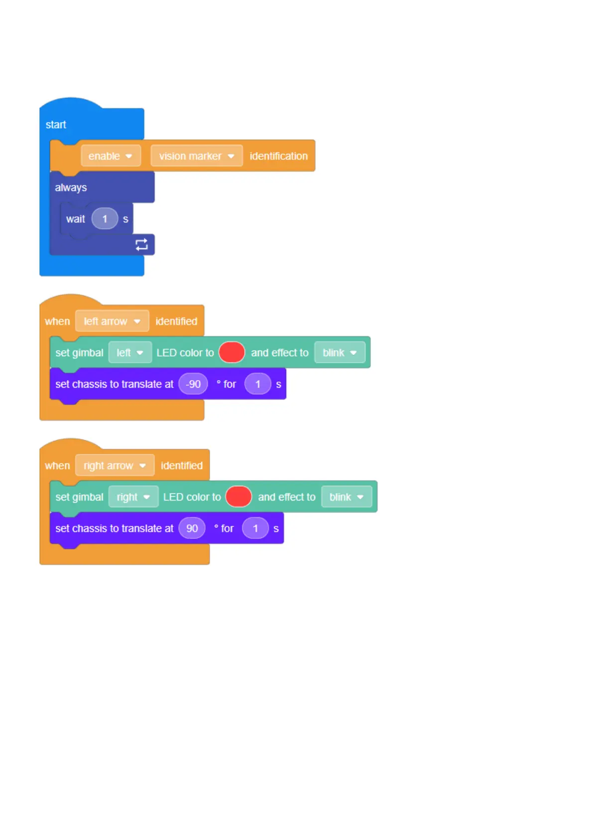 translate left for 1 second; when the robot identifies a right arrow, the right turn LED indicators on the gimbal