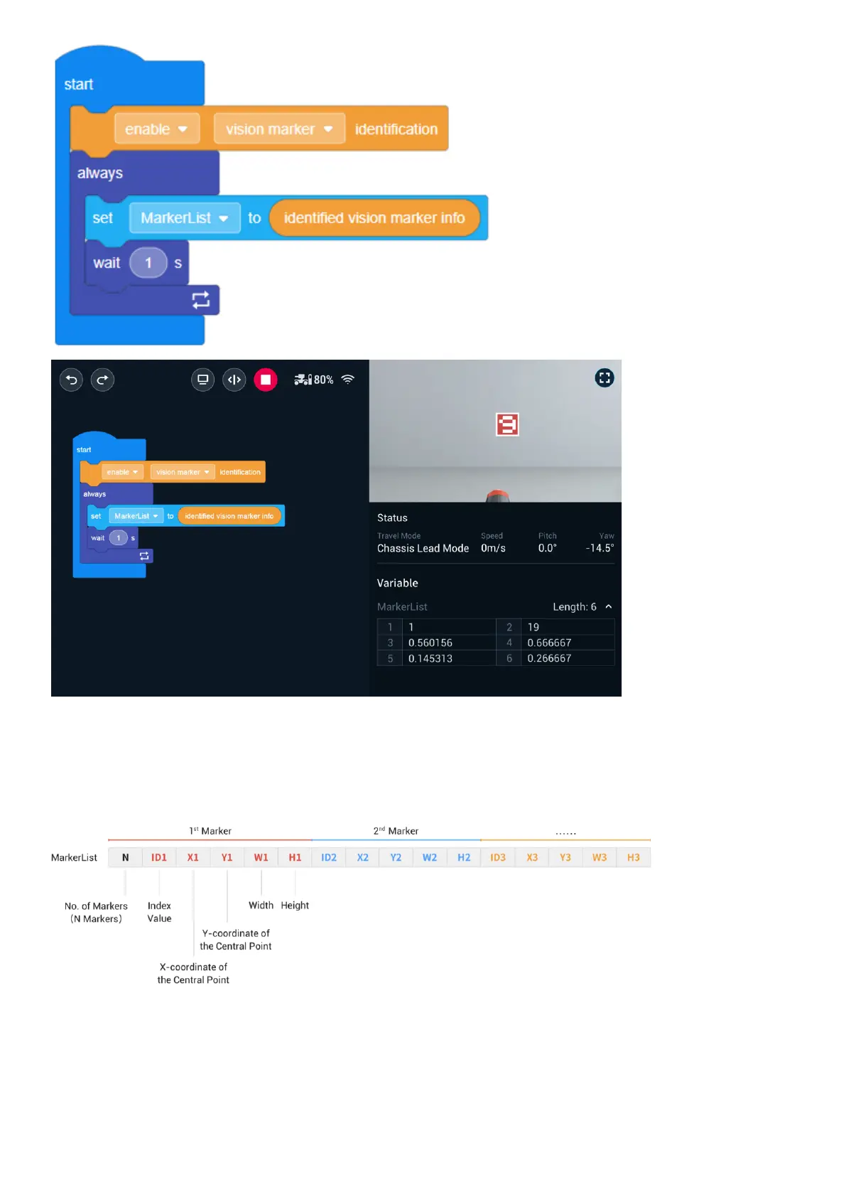 Marker ID, X-axis of the center point, Y-axis of the center point, W-width and H-height. The same format is