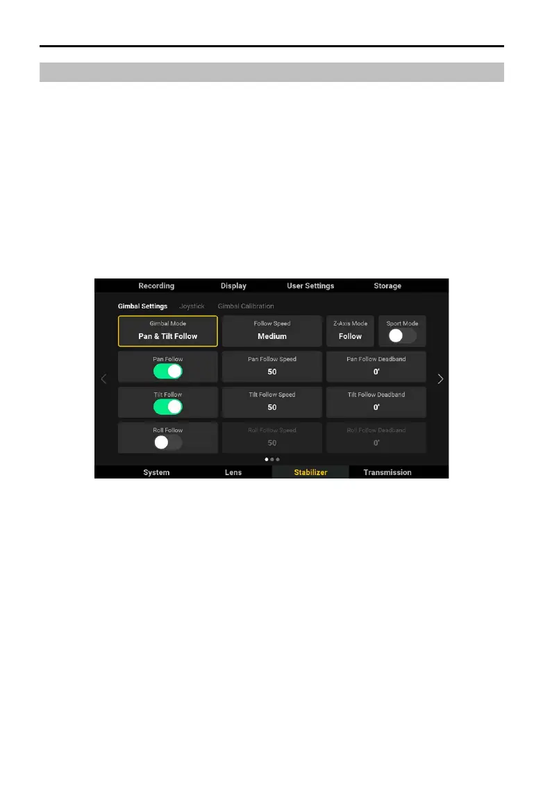 select Stabilizer, Gimbal Settings, and Gimbal Mode. When not using ActiveTrack, press and hold the