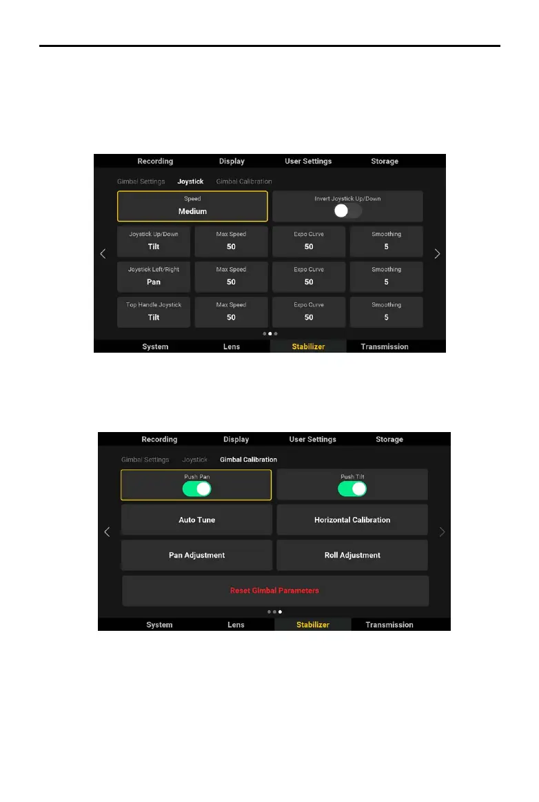 To control the pan and tilt axis manually, enter the high-bright main monitor menu, select Stabilizer, and