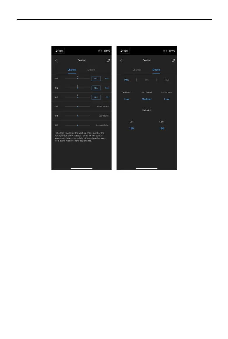 and pan axes by default. The user can customize channel mapping by tapping on the name of
