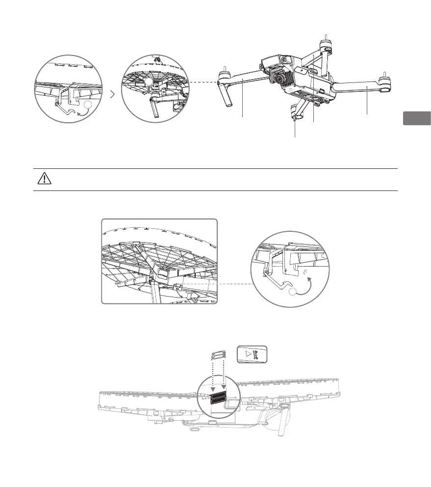 3. 安裝完畢後,用保護罩固定扣將前機臂槳葉保護罩下端與後機臂保護罩上端扣住以固定,如圖所示。