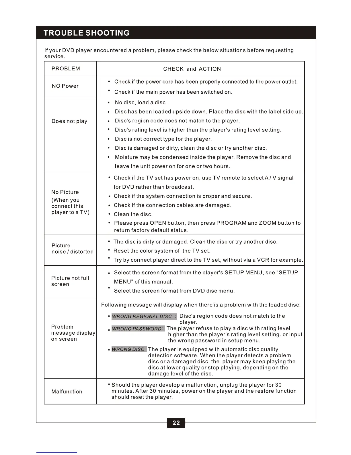 DK Digital DVD-228 - Trouble Shooting; Common Problems and Solutions
