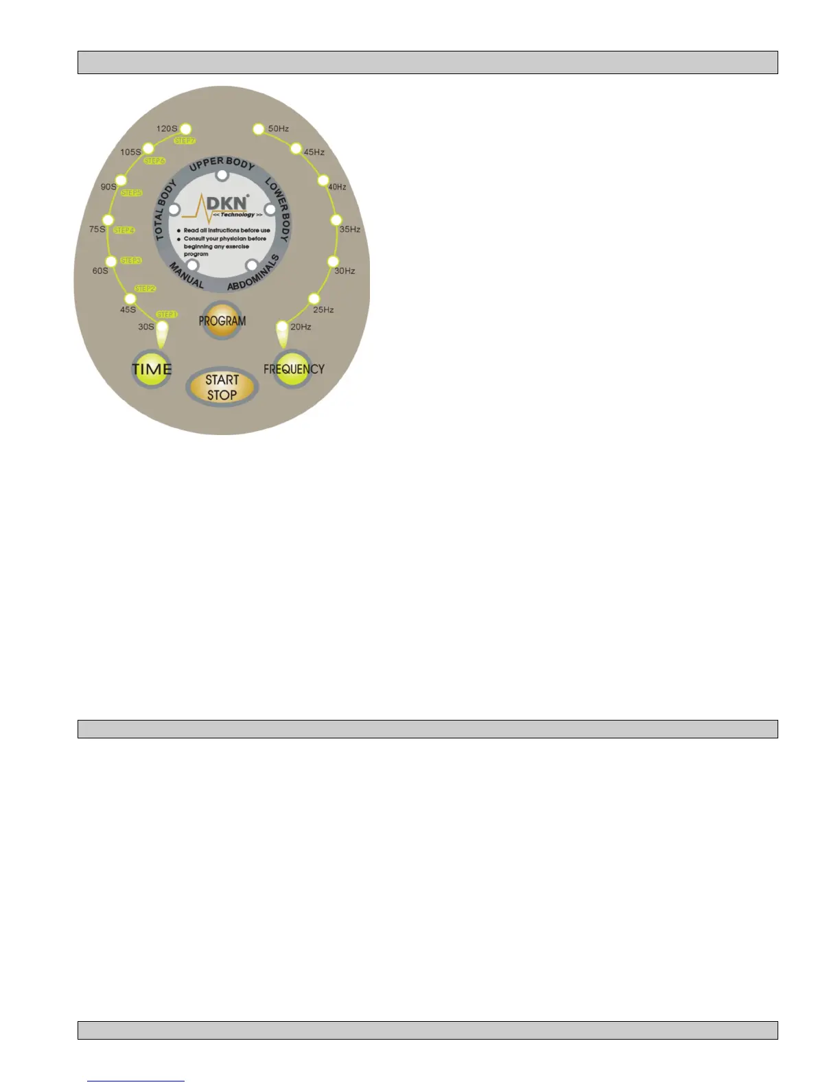 1. LCD’s: Posture, Program mode (centre display ) , Run time (left hand side display), level (frequency Hz) (right