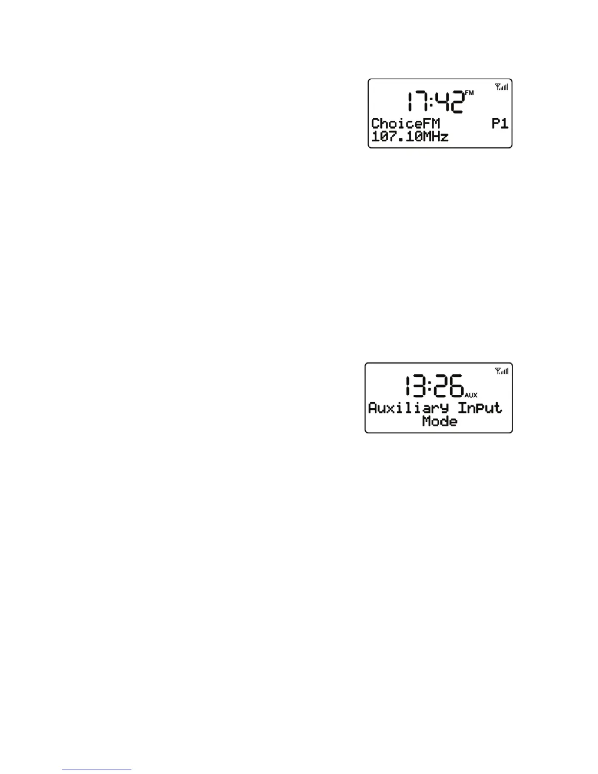 Aux In-modus spiller lyd fra en ekstern kilde som f.eks. MP3-spiller.