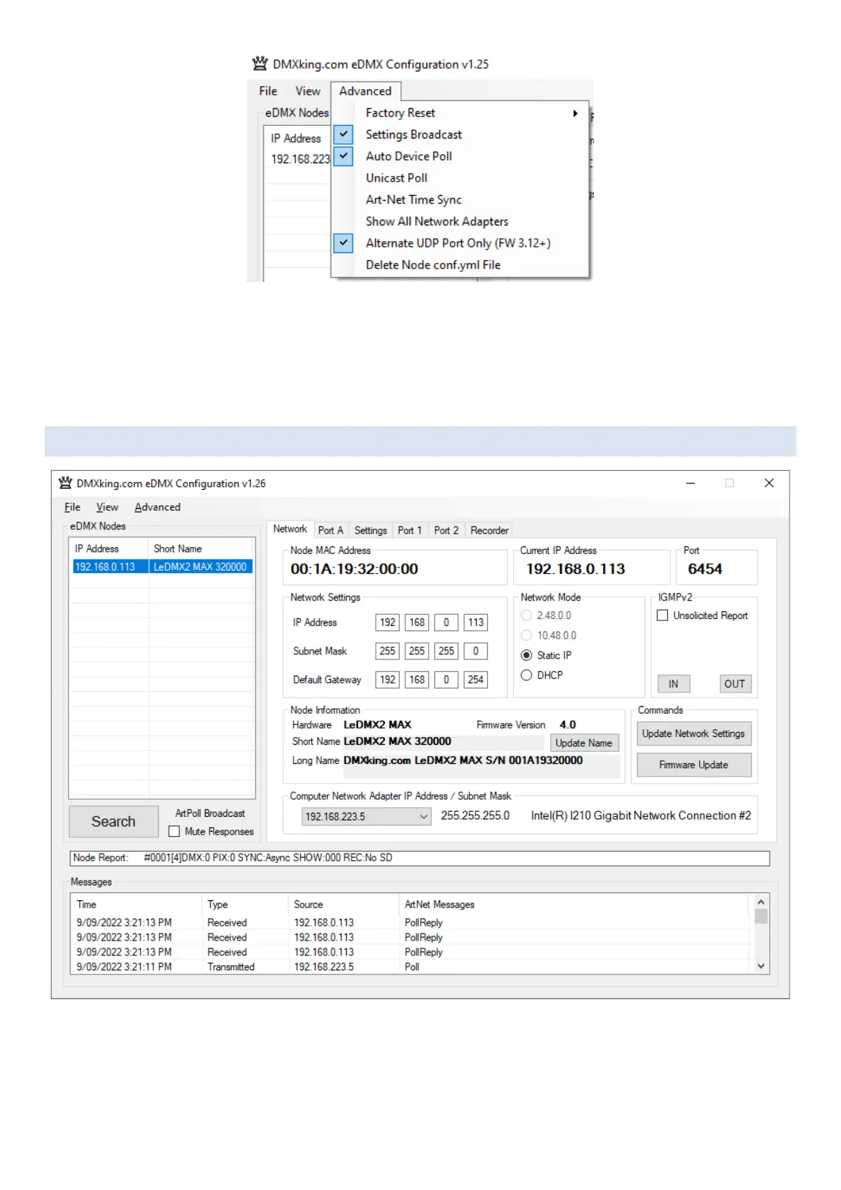 eDMX Configuration can find and configure eDMX MAX hardware on different IP subnets from the computer network adapter.