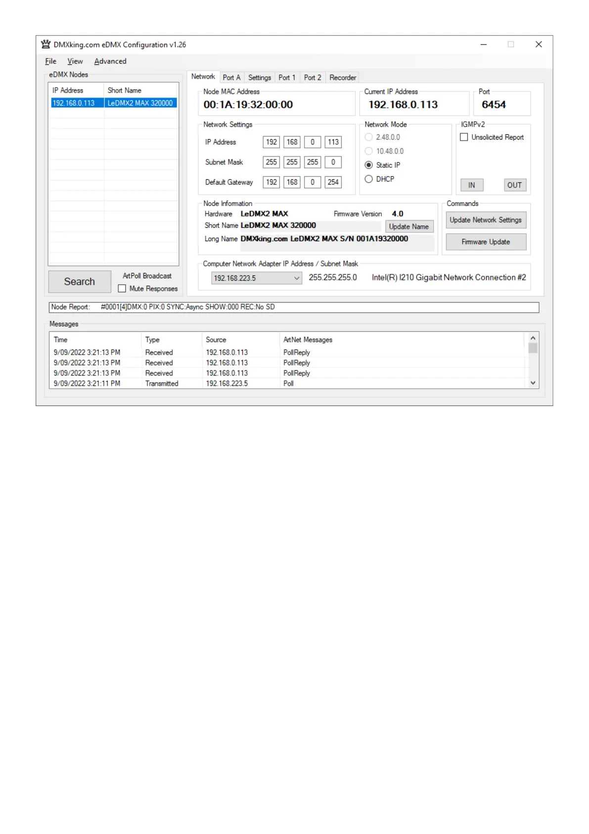Upon startup eDMX nodes are automatically detected and displayed by IP address. To poll for new devices or just check the