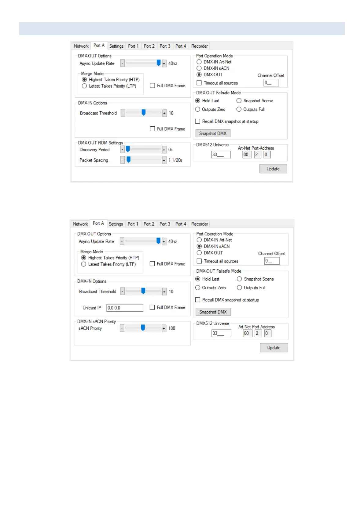 Port Operation Mode: DMX-IN sACN with sACN Priority 100