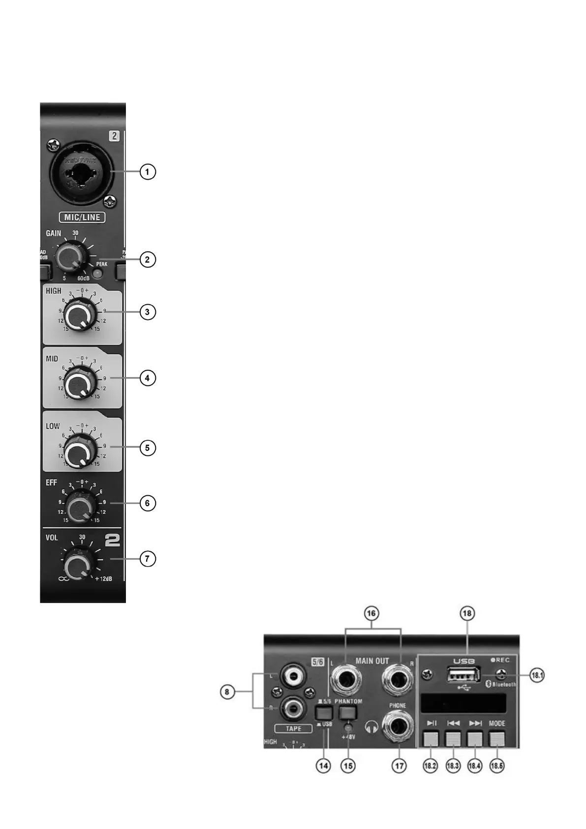Potencjometr EFF reguluje poziom efektu dodawanego do odpowiadającego kanału.