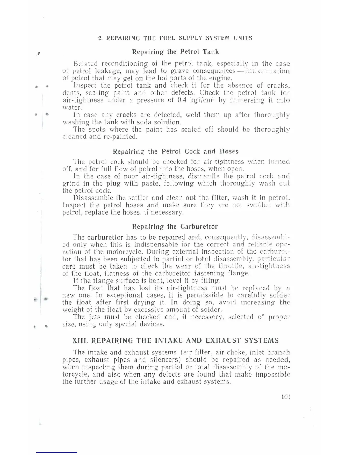 Dnepr MT9 - Carburetor Repair; Intake and Exhaust Systems Repair; Petrol Tank;Petrol Cock and Hoses Repair; Repairing the Fuel Supply System Units