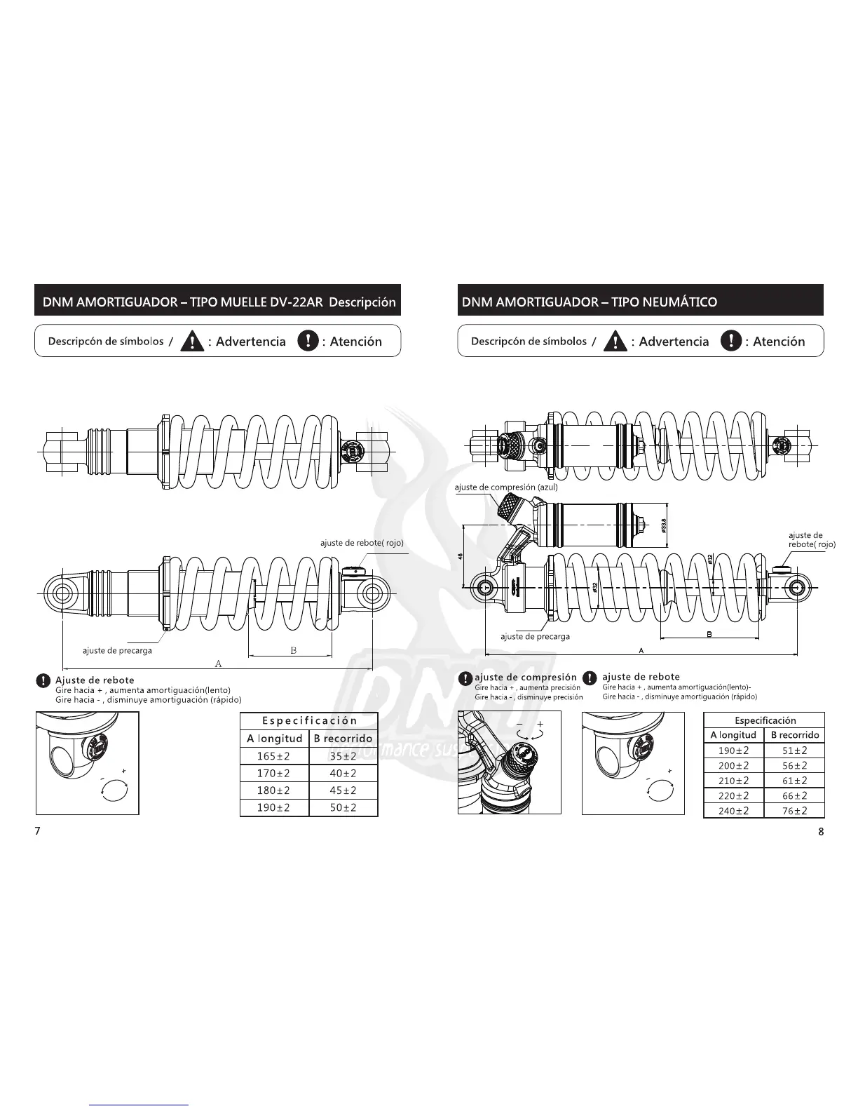 DNM DV-22AR - DV-22 AR Spring Shock Absorber; Installation & Specifications; Rebound Adjustment; BURNER-RCP 2 S Pneumatic Shock Absorber