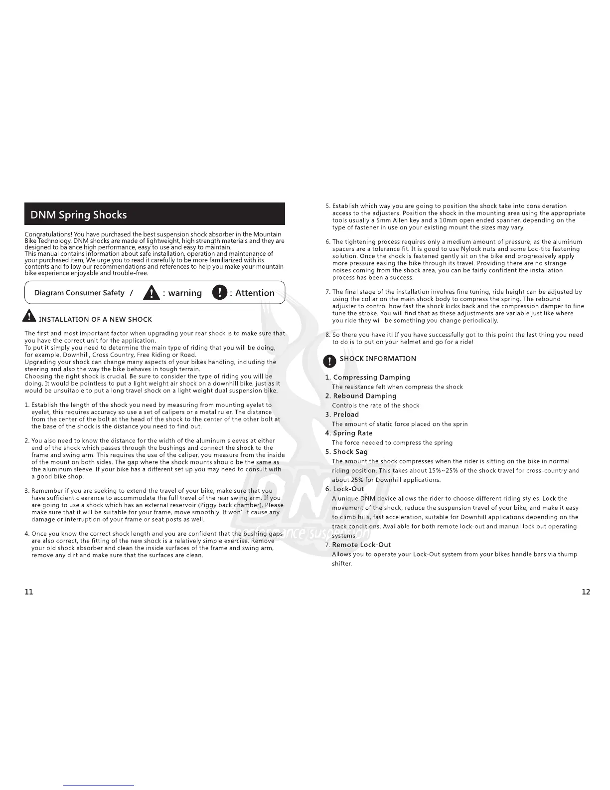 DNM DV-22AR - Installation of a New Shock; Consumer Safety Diagram; Shock Information