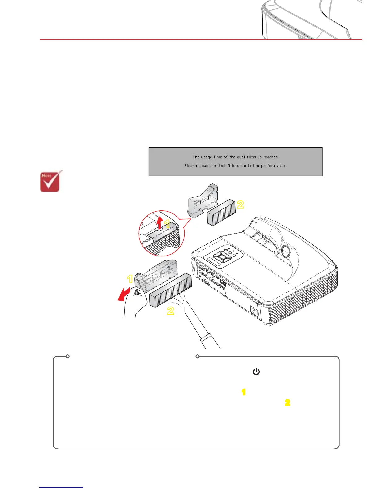 5. Turn on the projector and reset the filter usage counter after the dust filter is