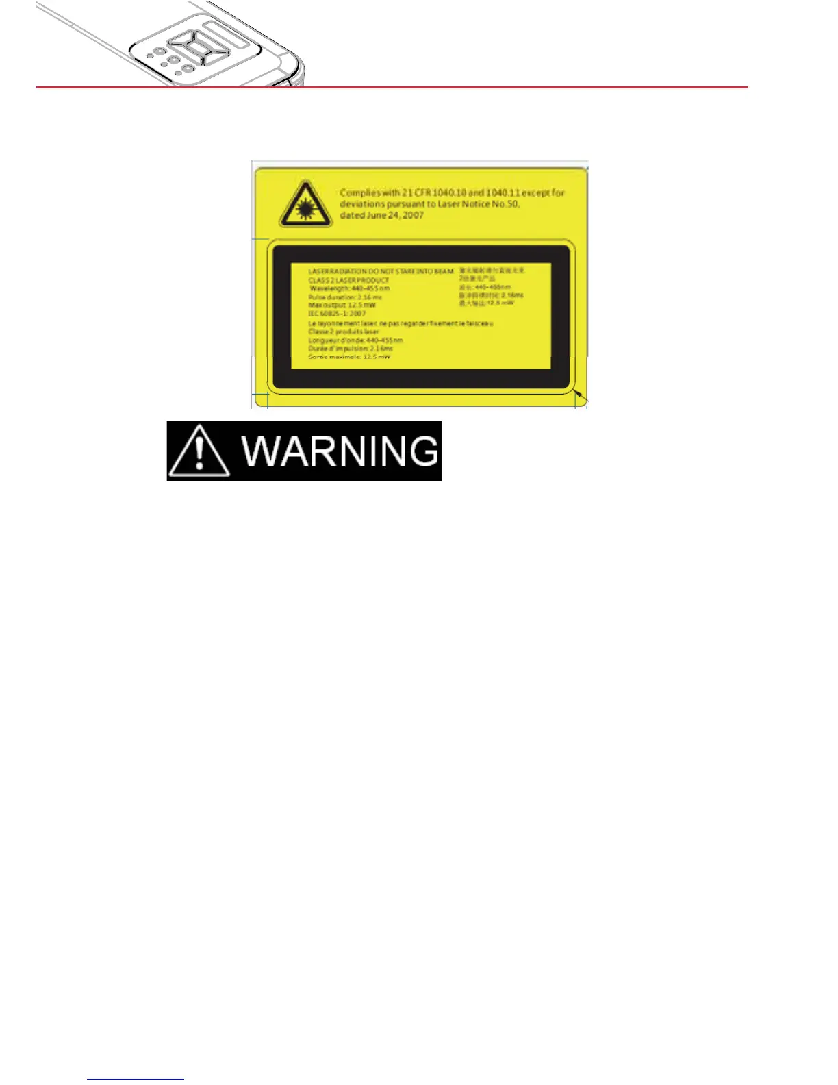 > Class 2 laser product, Do Not Stare Into Beam.