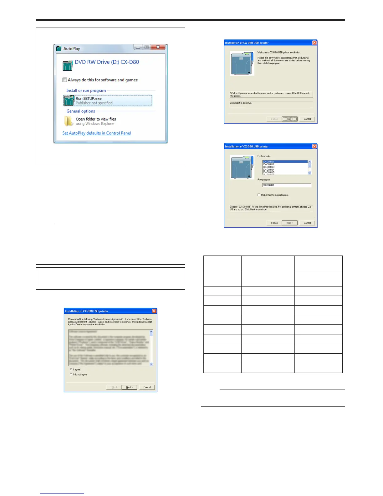A [Installation of CX-D80 USB printer] screen appears.