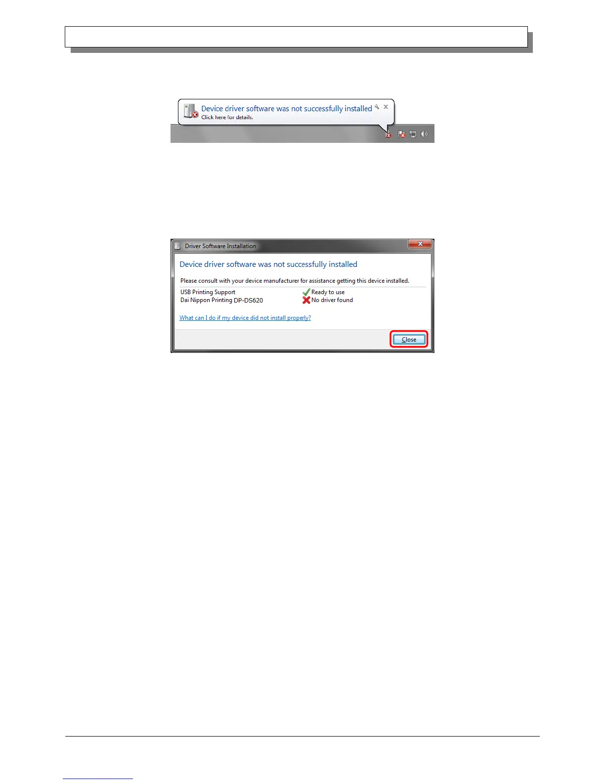 When it was not possible to install the DP-DS620 printer driver correctly, the following message appears in the taskbar: