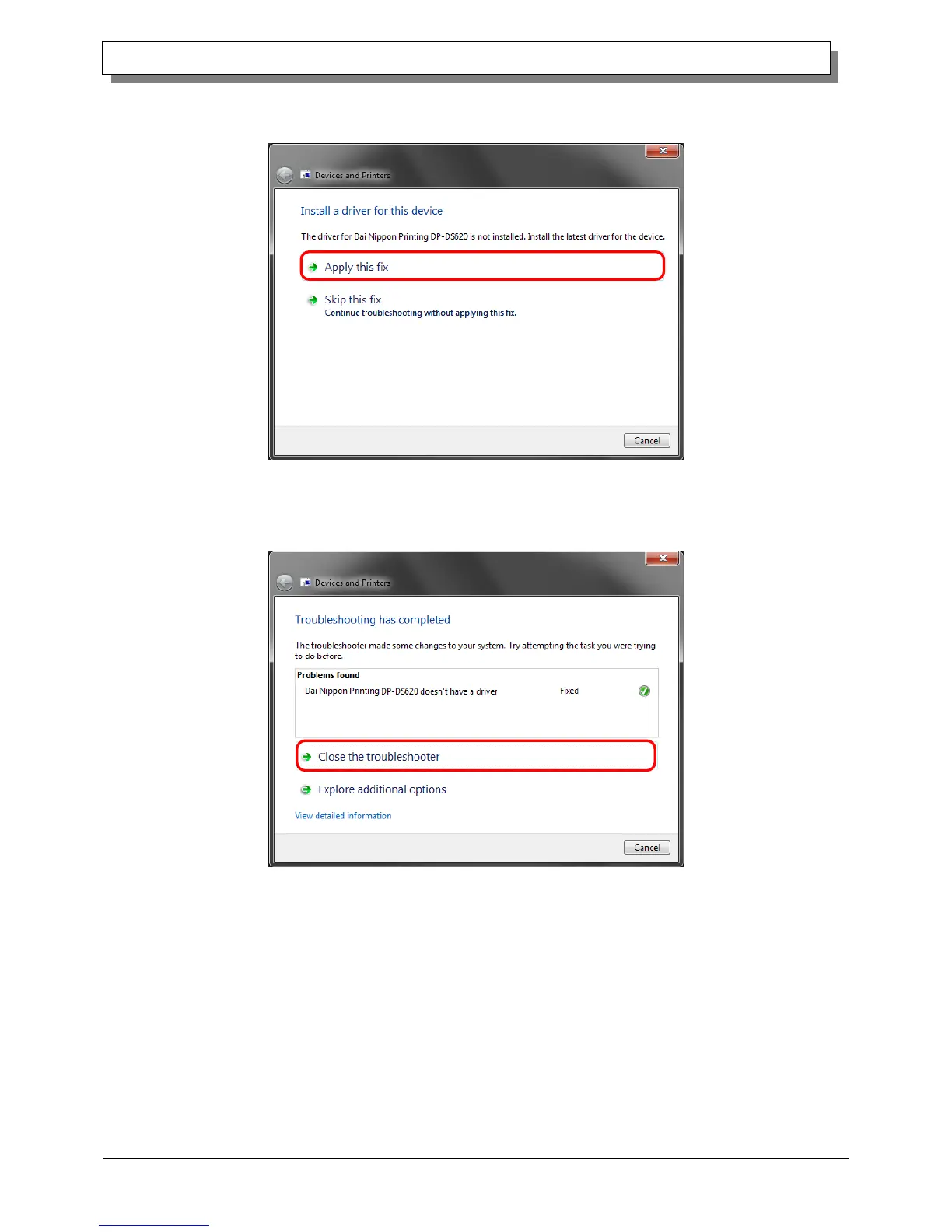 If the driver is installed, the message "Troubleshooting has completed" appears. Click "Close the troubleshooter" to close