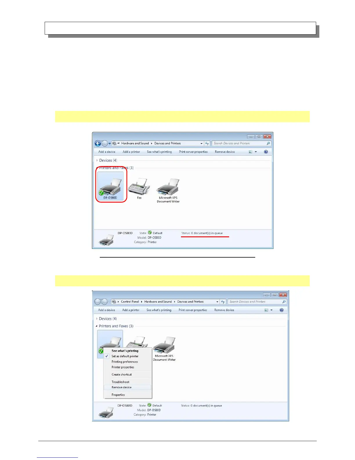 Printers” window, select the DP-DS80D printer, display the pull-down menu with the right click, and click on “Remove device”.