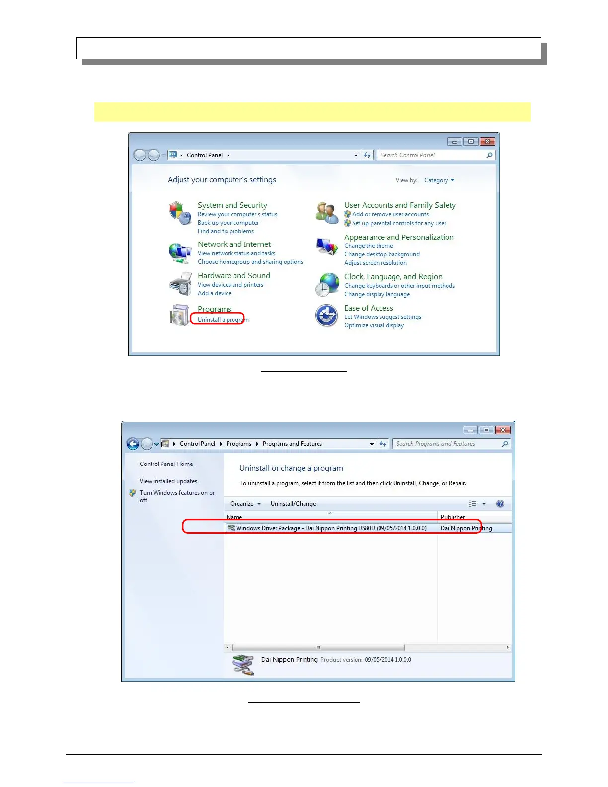 (2) When the “Uninstall or change a program” window appears, double-click on “Windows Driver Package – Dai Nippon Printing