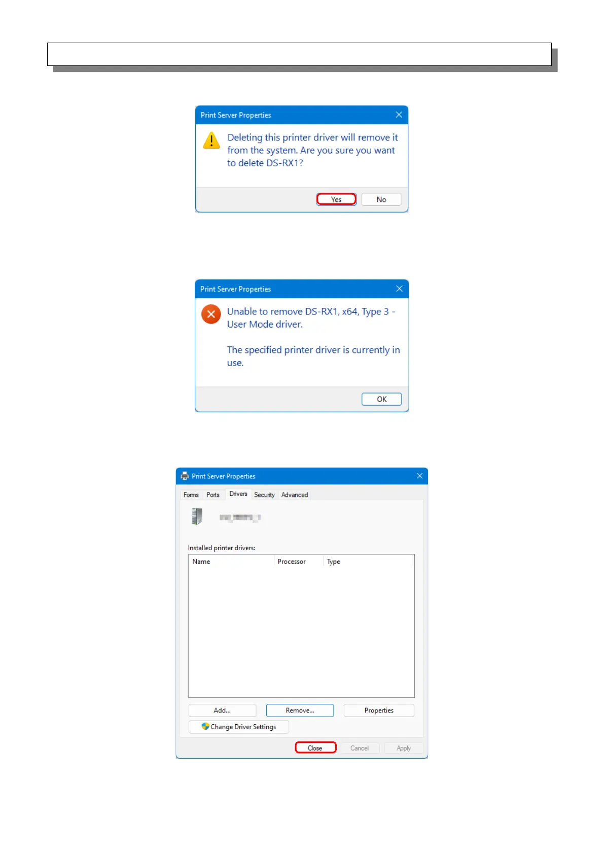 8) In the “Print Server Properties” dialog box, confirm that DS-RX1 was deleted, and then click