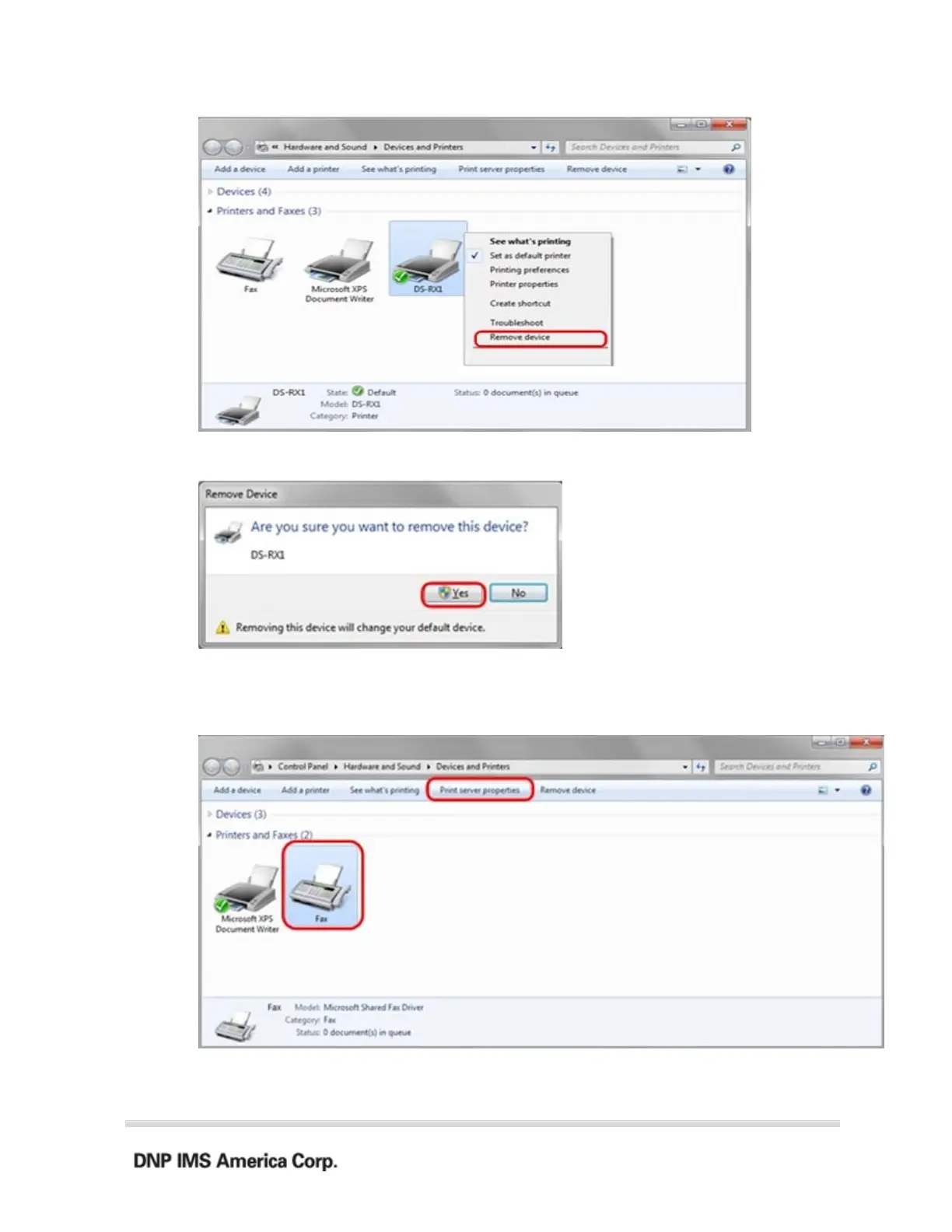 the list of installed printer drivers, select “DS-RX1”, and click the “Remove”