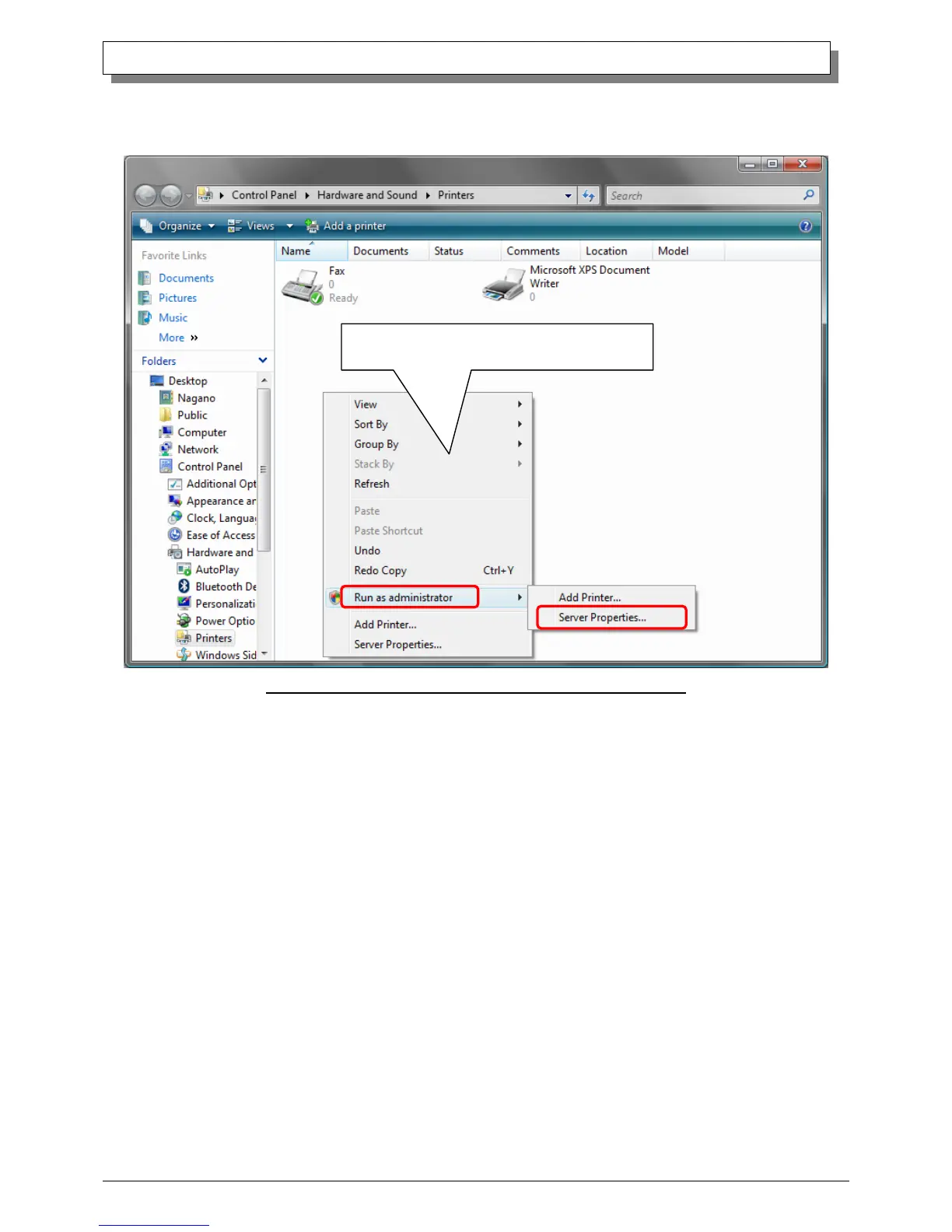 Fig 3.3 Pull-down menu opened by right-clicking on the Printer window