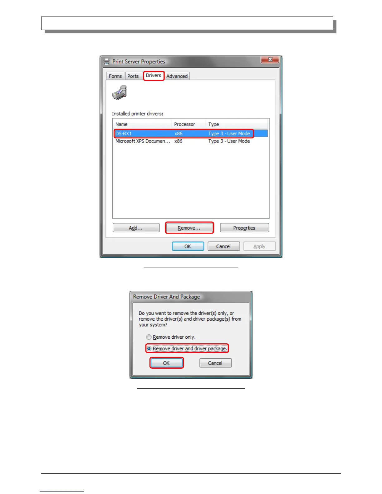 (7) When the Remove Driver and Package window appears, select “Remove driver and driver package”, and click on the”OK”