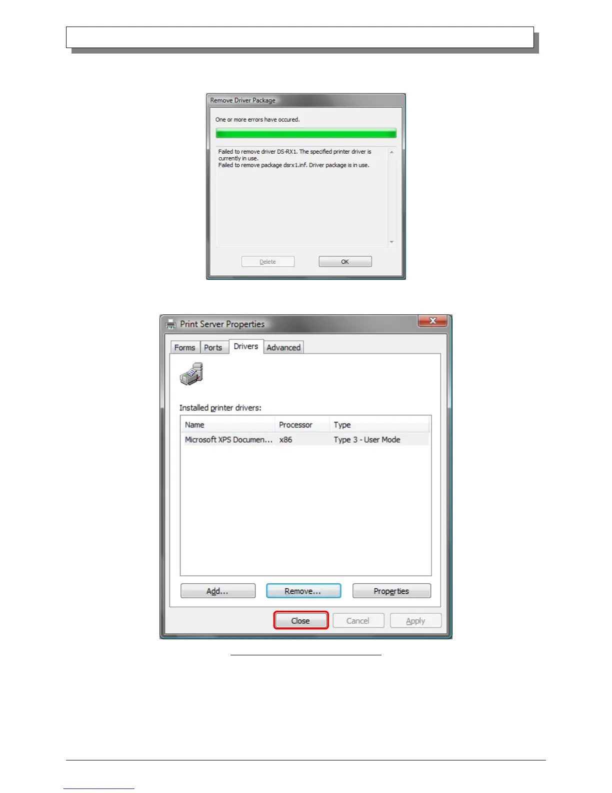 (11) Using the Print Server Properties window, confirm that “DS-RX1” has been removed, and click on the “Close”
